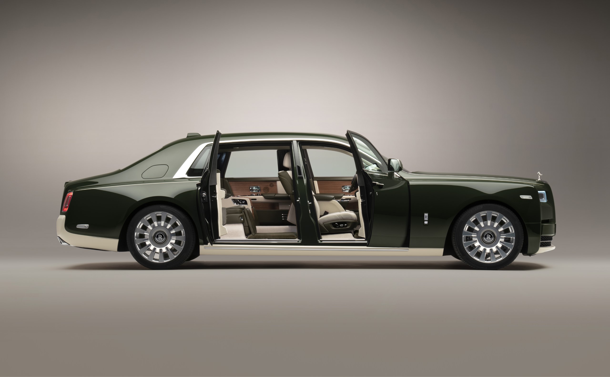 The interior is finished predominantly in Hermès Enea Green leather, extending to immediate touchpoints for the client. In a first for Rolls-Royce, Hermès ‘Toile H’ canvas adorns the door armrests, centre and rear consoles and, most notably, the signature headliner.