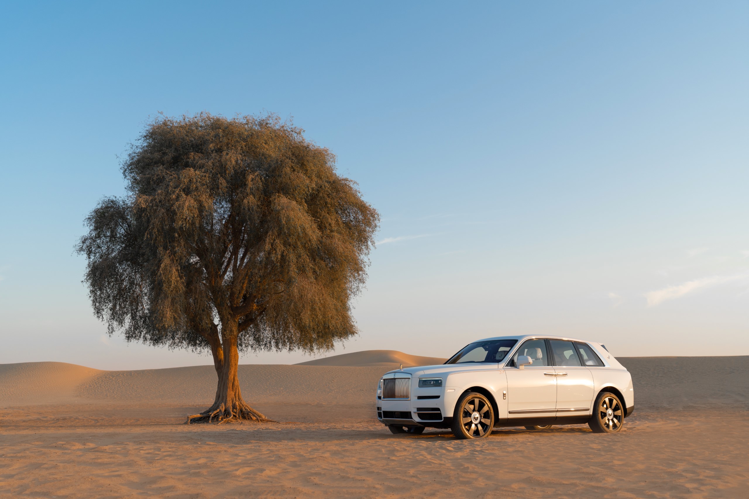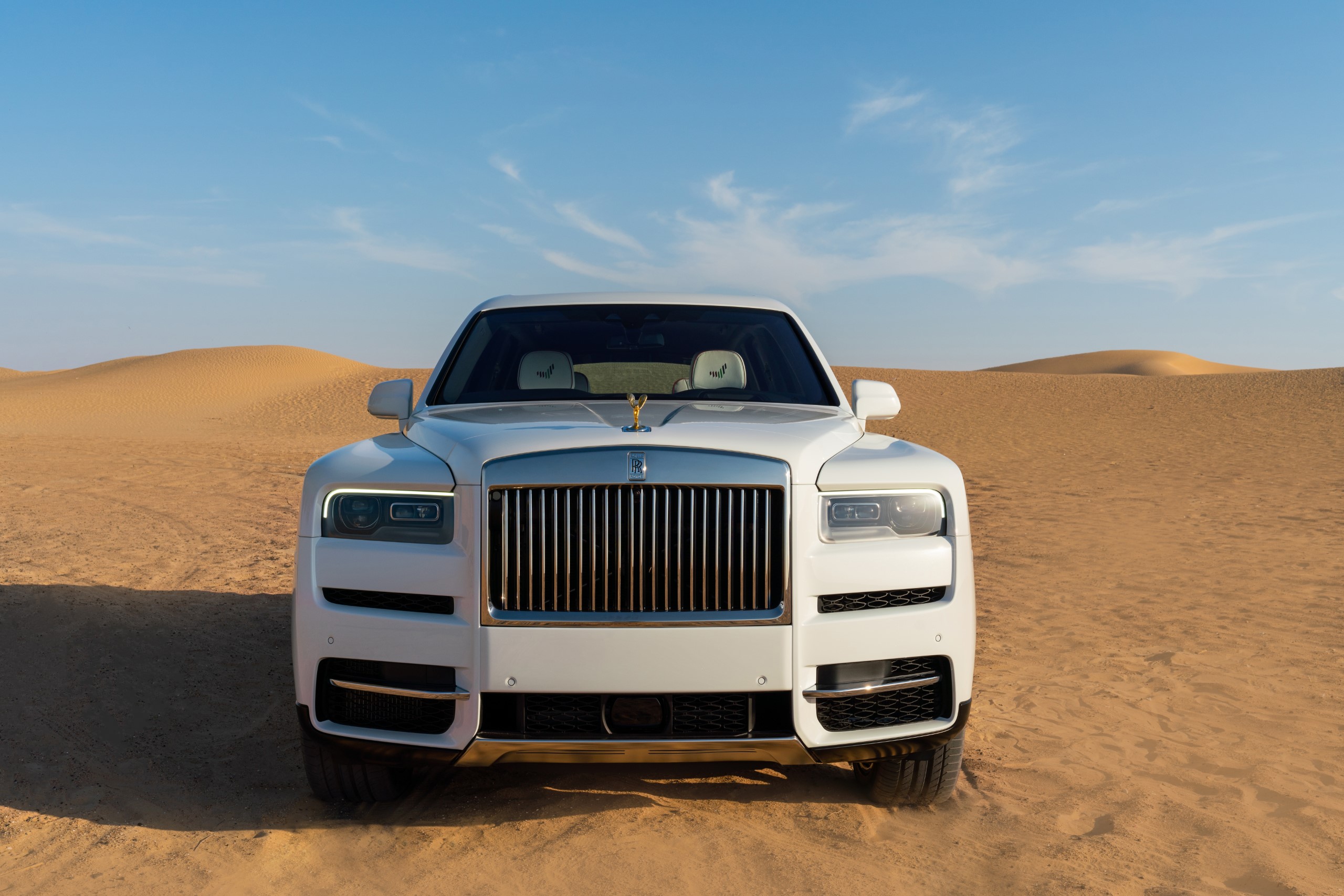 A spectacular, one-of-a-kind Cullinan was created to mark the UAE’s historic Golden Jubilee in 2021. The exterior, finished in Crystal over Arctic White, was adorned with a hand-painted double coachline – the upper line in Hotspur Red, the lower Fame Green. The effect was completed with a Gold Bullion Coachline Motif, the national flag rendered in Hotspur Red, Fame Green and Black on the C-Pillar Motif, and a double wheel-centre pinstripe to represent the National Flag of the UAE.