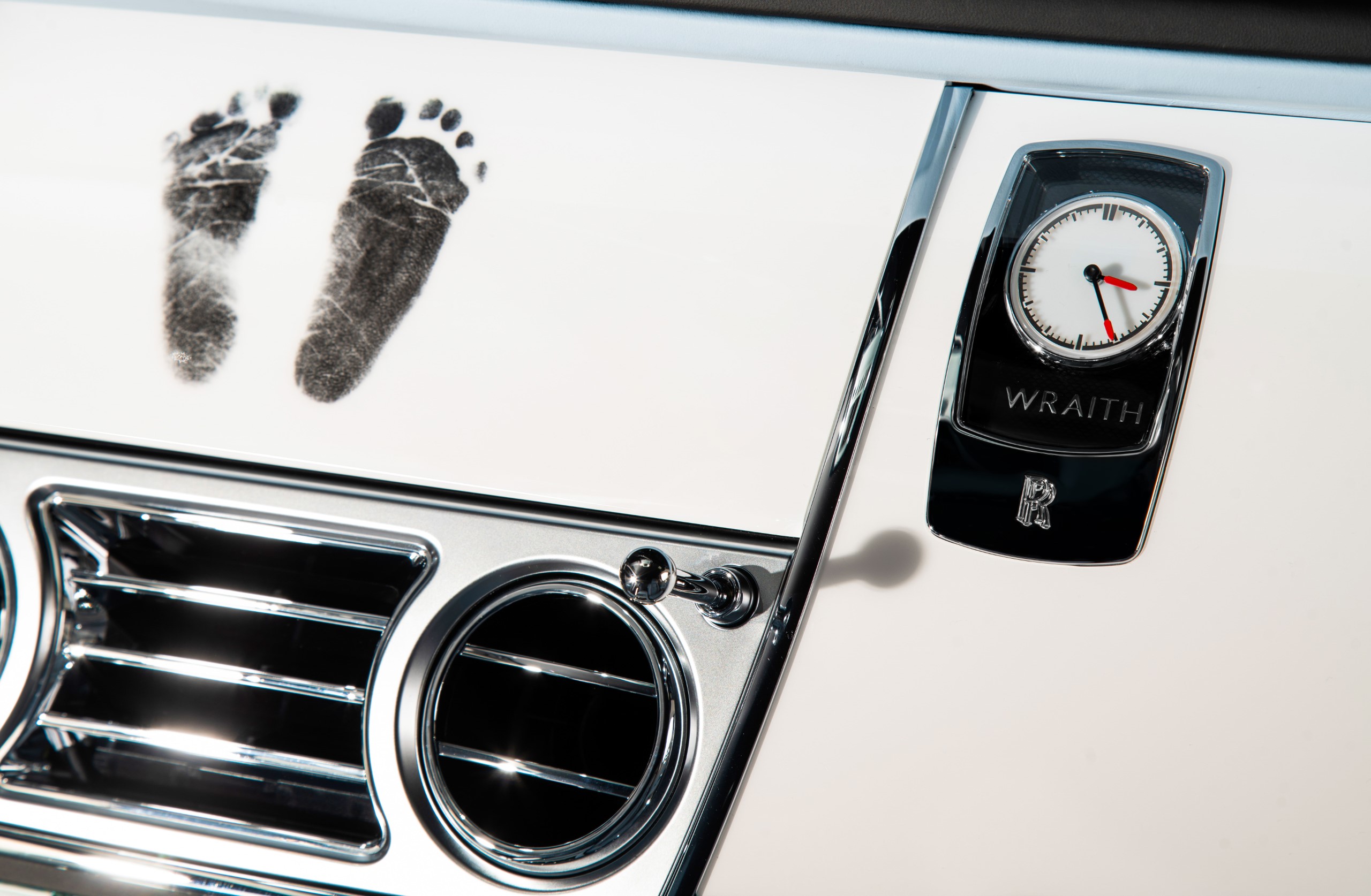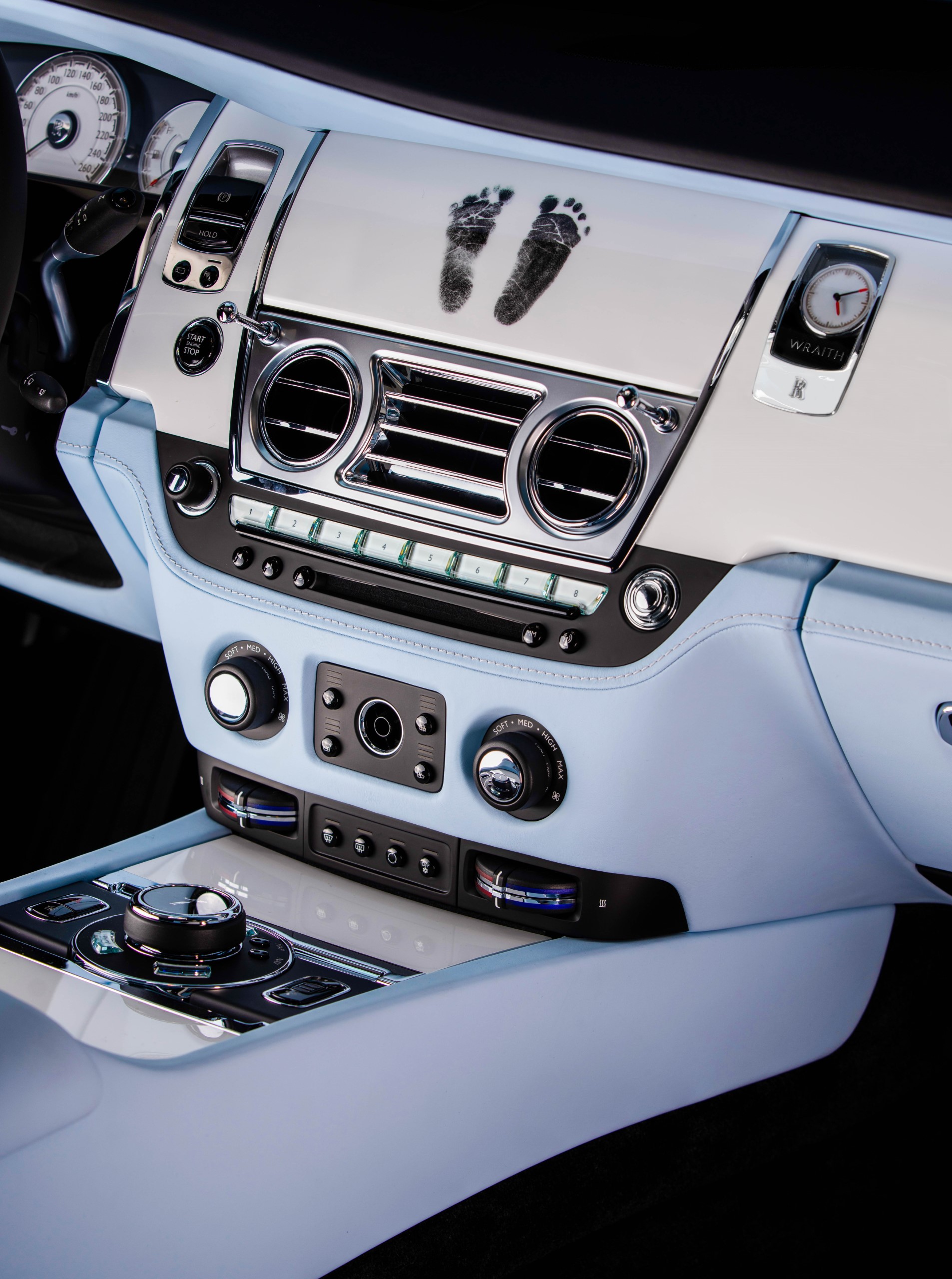 Inside, an artwork featuring a baby girl’s footprints is depicted on the Piano White monitor lid, a tribute to the client’s long sought-after bundle of joy. The two-tone interior features Charles Blue and Seashell in natural grain leather. A Bespoke Starlight Headliner continues the celebration with a personalised constellation paying tribute to her daughter.